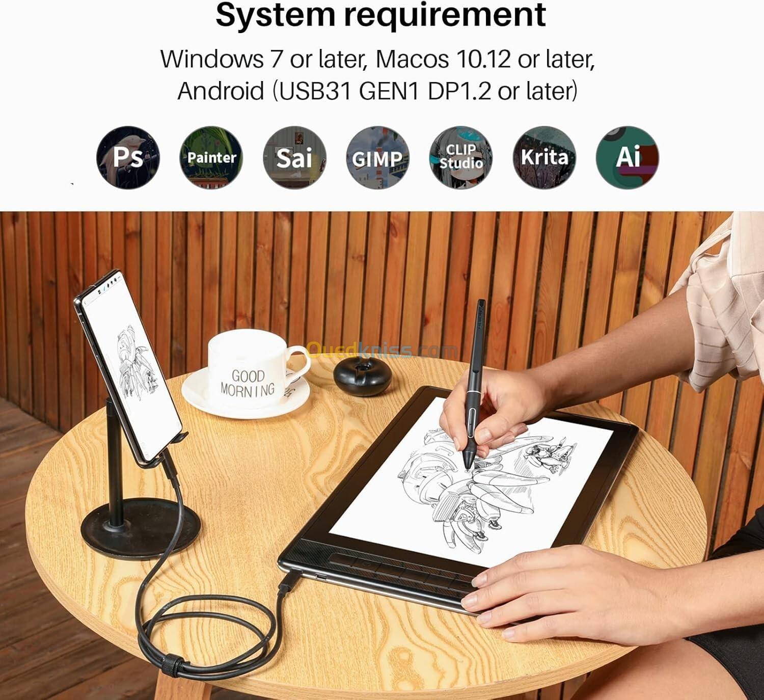 Connexion puissante : cette tablette d’art dispose d’un port USB-C qui prend en charge les signaux HDMI et DP. Vous pouvez facilement et rapidement le connecter à une grande variété d’appareils via un câble USB-C complet. Vous pouvez également utiliser le câble 3 en 2 (HDMI) qui est plus stable et durable que le câble 3 en 1. Profitez d’un espace de travail sans encombrement avec une puissante connectivité USB-C.