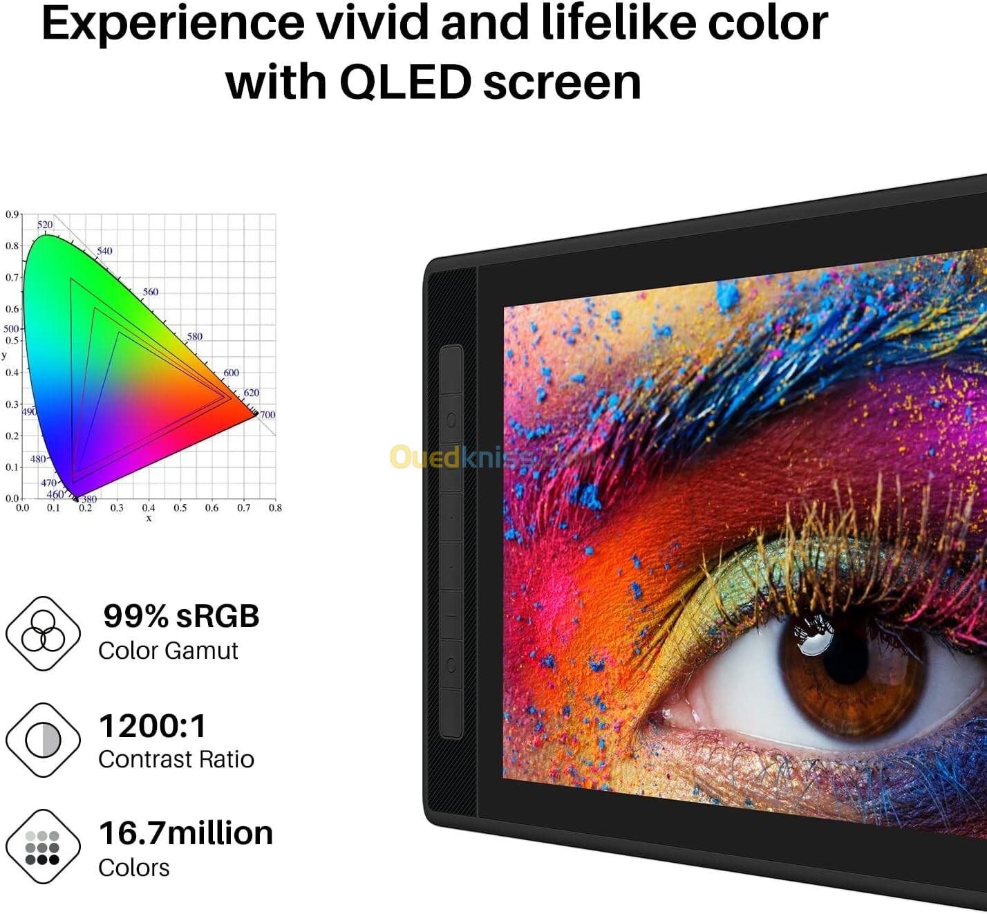 Couleurs réalistes : alimentée par la technologie Quantum Dot, la tablette d’art graphique Kamvas Pro 13 (2,5 K) avec un écran capable de fournir 16,7 millions de couleurs avec une gamme de couleurs 145 % sRGB Volume (109 % Adobe RVB) et un contraste élevé. rapport de 1200: 1 qui assure une gradation et une précision des couleurs fluides