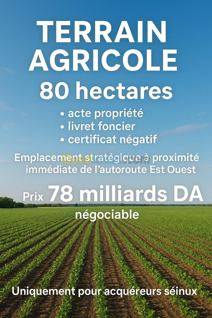 Terrain agricole 80 hectares acte propriété livret foncier certificat négatif Emplacement stratégique à proximité immédiate de l’autoroute Est Ouest Prix 78 milliards DA négociable Uniquement pour acquéreurs sérieux ""